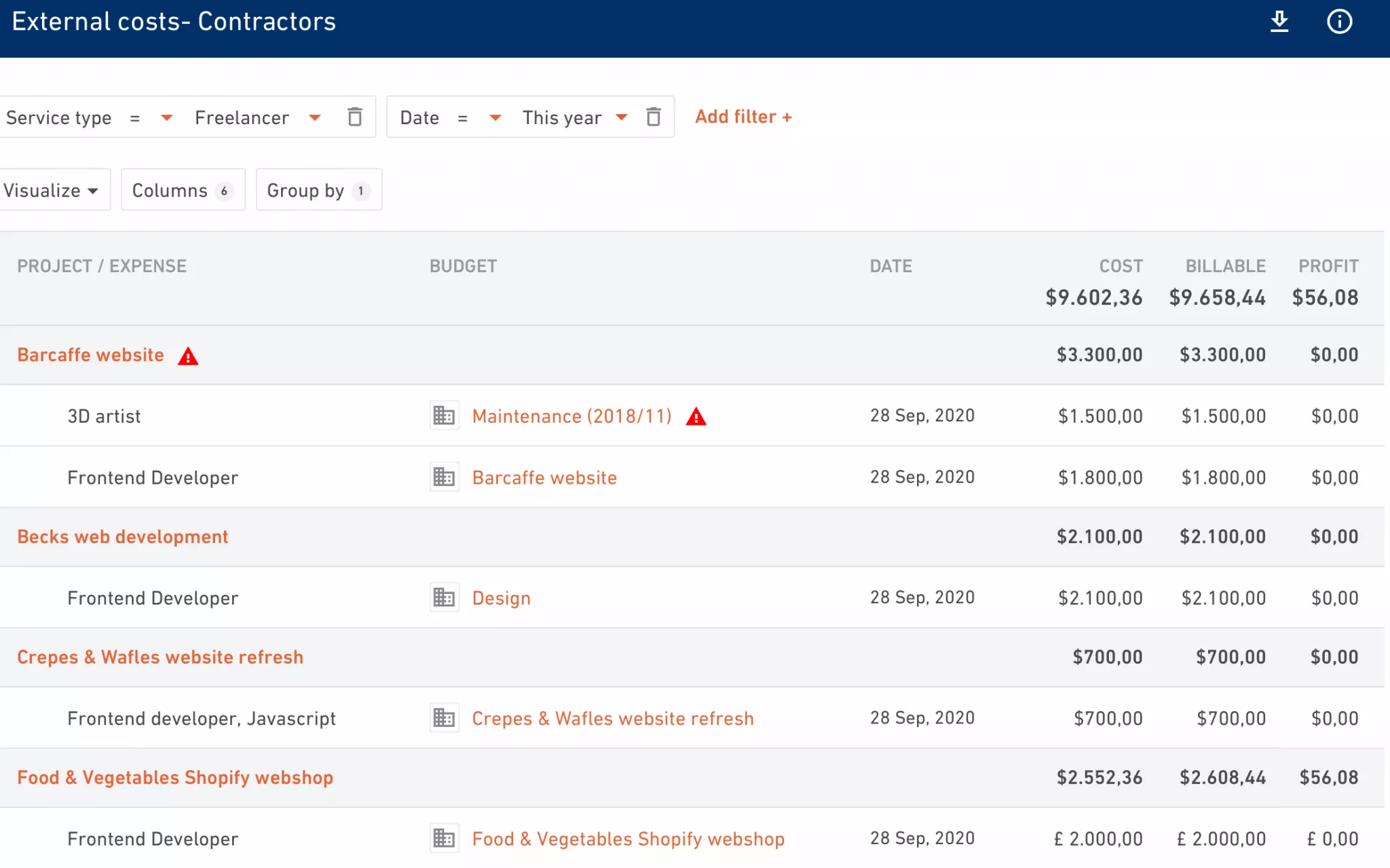 Then, have a look at the “billing” of your freelancers. Analyze whether you’ve made a profit on these services by looking at the markup.