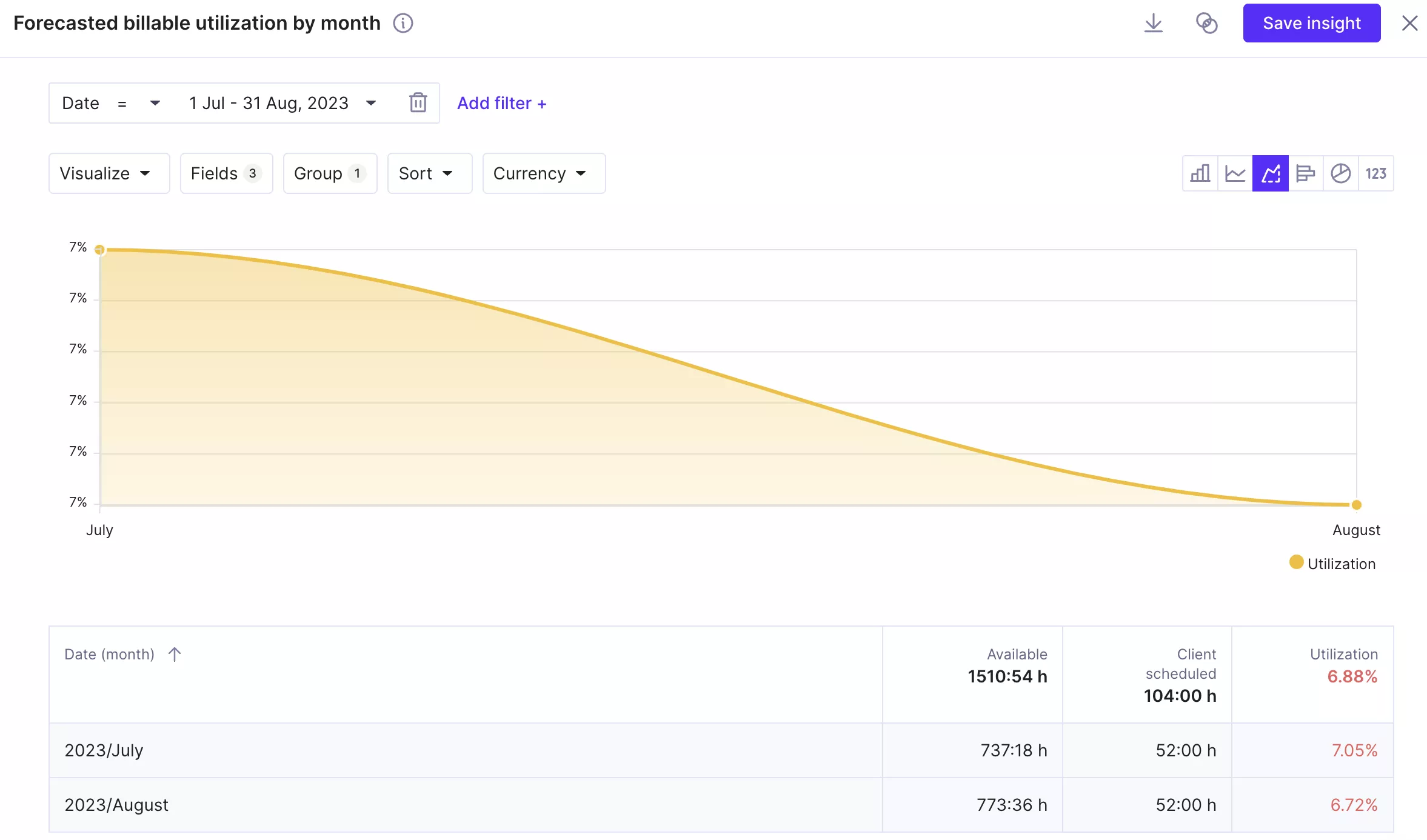 This report will tell you if your existing team is utilized in full, based on their availability and future planned time. Using this data, you’ll be able to decide if there is enough work for all or if you should perhaps look for new talent.